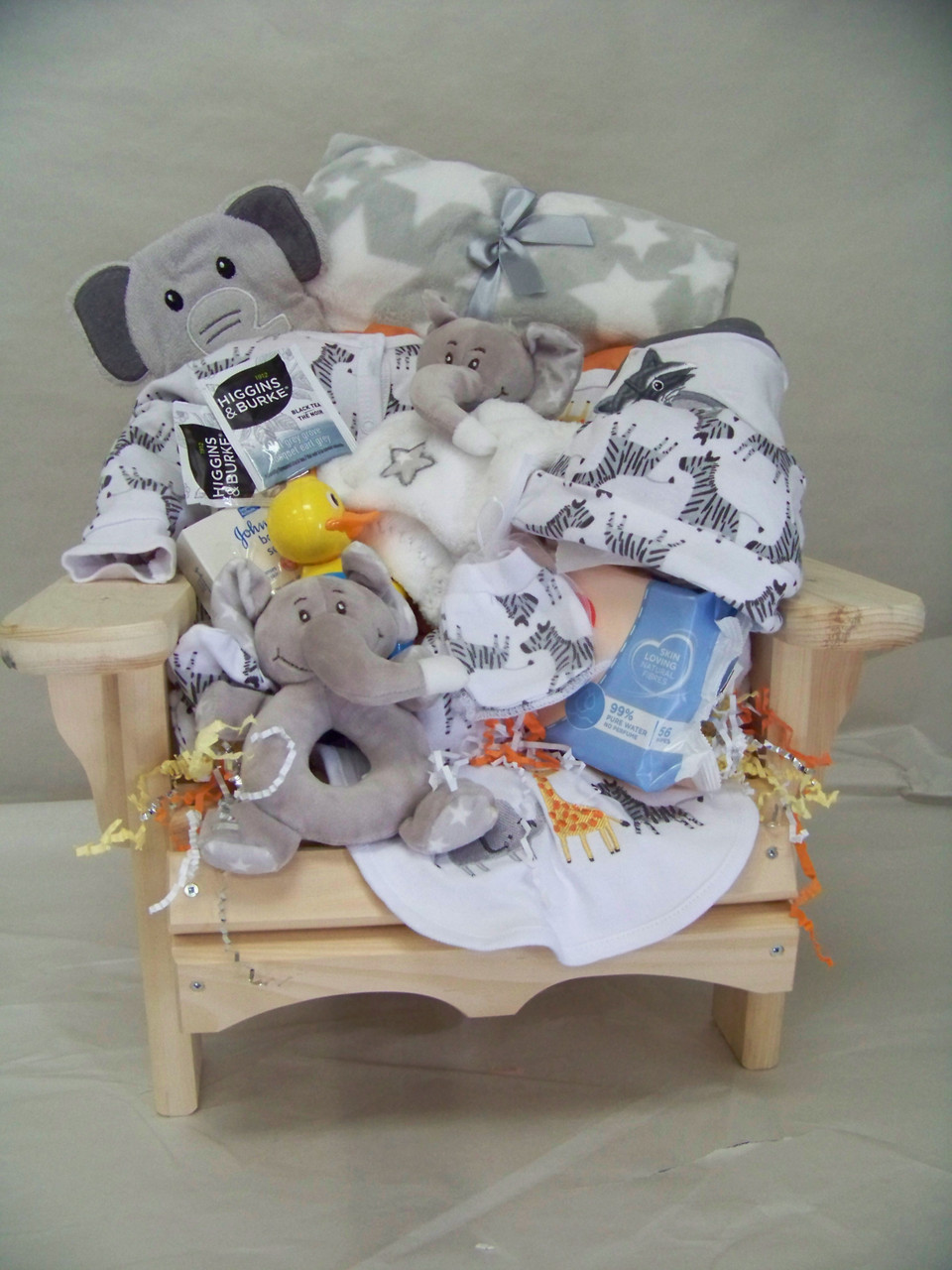 Everything baby needs for a cottage getaway. A full sleeper, a onesie, a hat, bib, socks and a large receiving blanket with a soft plush. Add a hooded towel, an animal wash mitt, some soap, a toy, etc. Don't forget to take the solid wood Muskoka chair with you. Are you packed yet ???