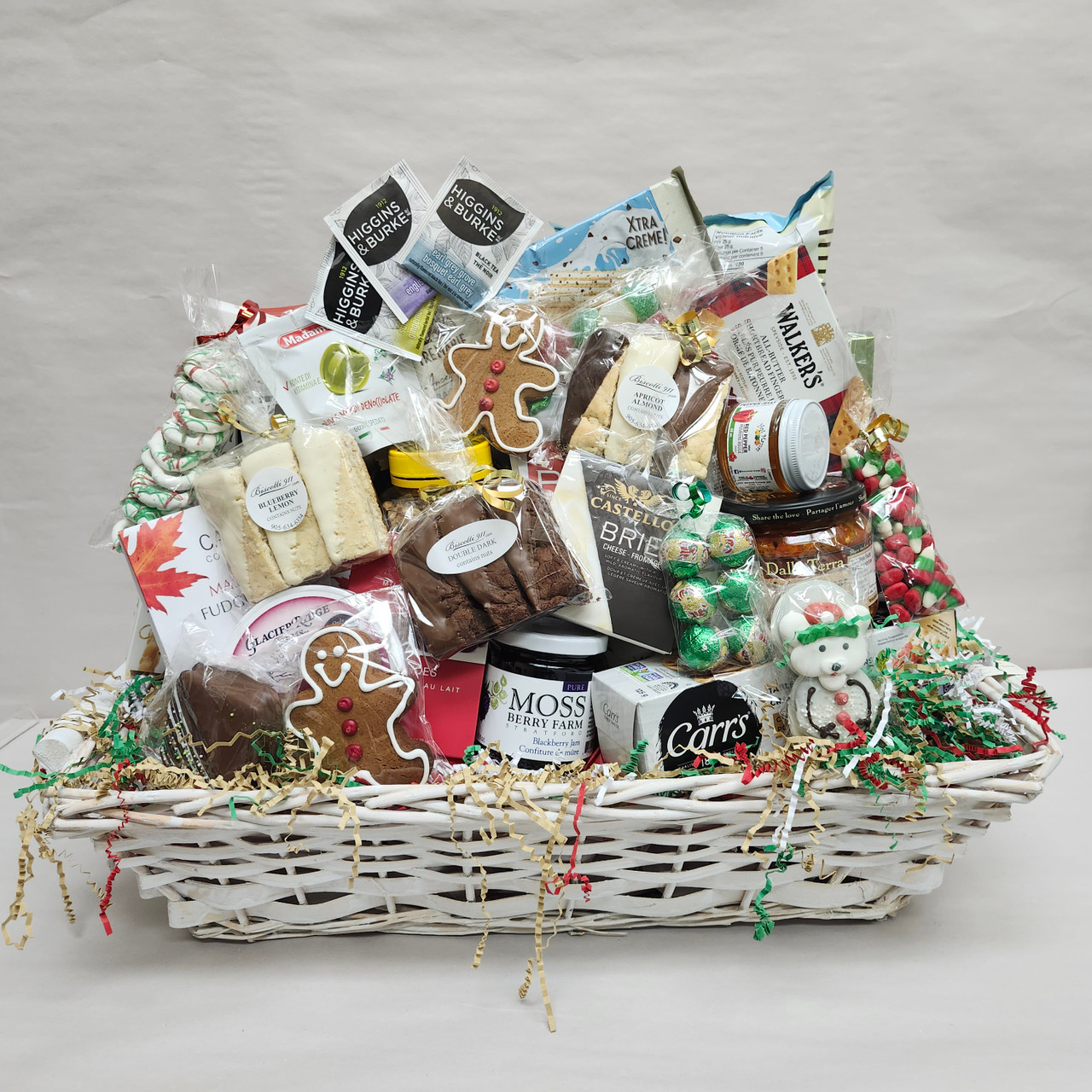 A truly exceptional presentation. We started with an x-large weaved basket 60 cm X 40 cm (24 in X 16 in). Then we filled it. Chocolates, chips, popcorn, nuts, crackers, cheese, antipasto, red pepper jelly, cakes, cookies, candies to start. Next we added licorice, pretzels, home made squares, hot chocolate, tea and of course our artisan biscotti and lots more. You will need family and friends to share with !!!