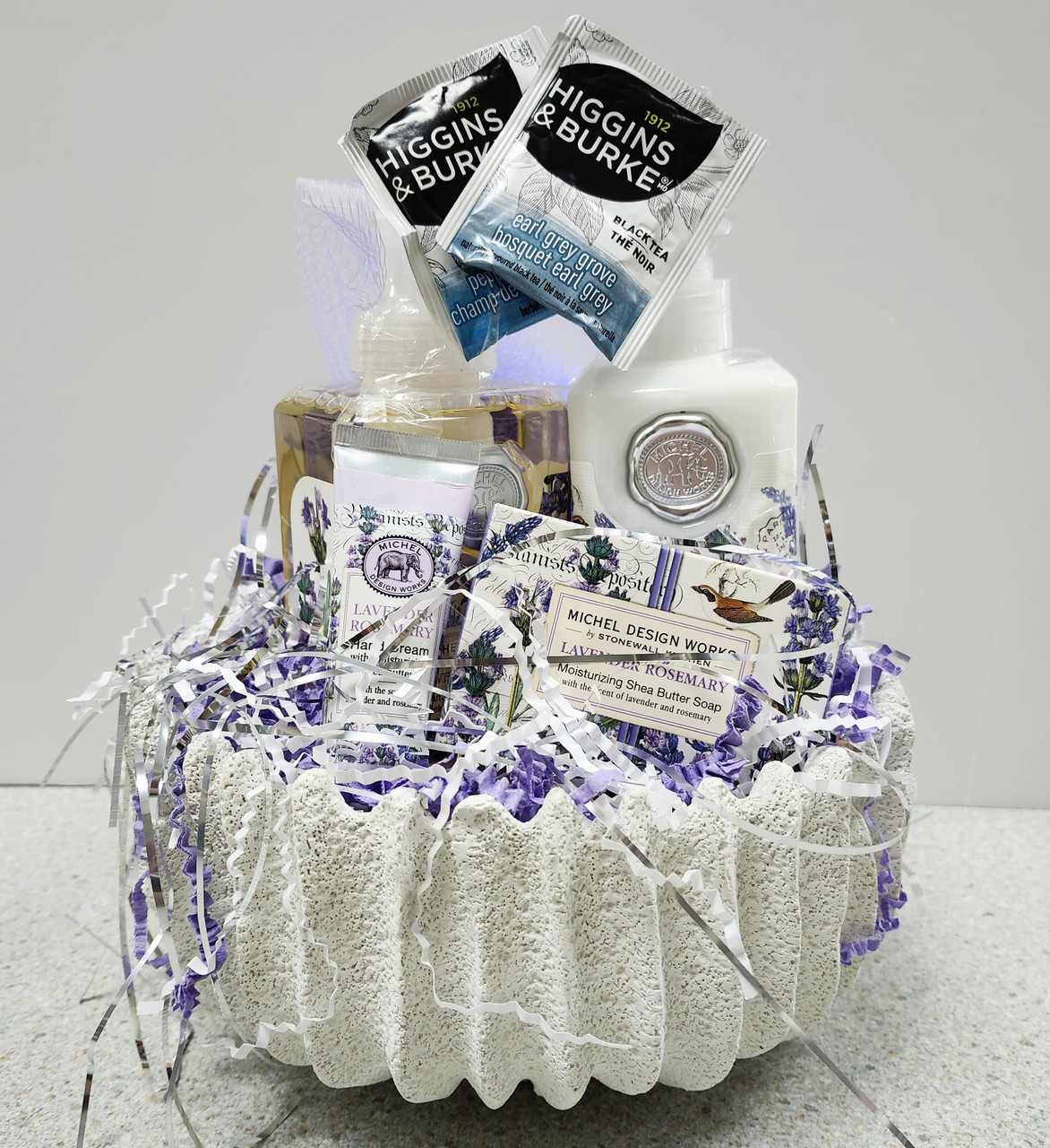 Enjoy this beautiful coral-like stone container filled with luxury body cream, an artisinal soap bar and a foaming hand soap all made with shea butter in lavender and rosemary. We have also added a scrubby and a travel hand cream.